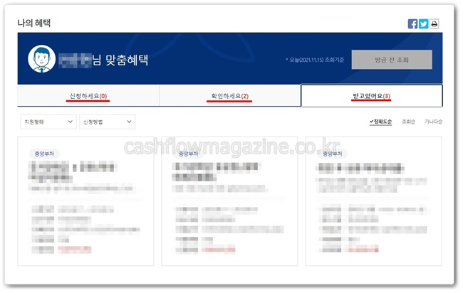 - 현재 신청가능한 혜택, 신청확인하여 받을 만한 혜택, 받고있는 혜택 등을 자세히 볼 수 있습니다.